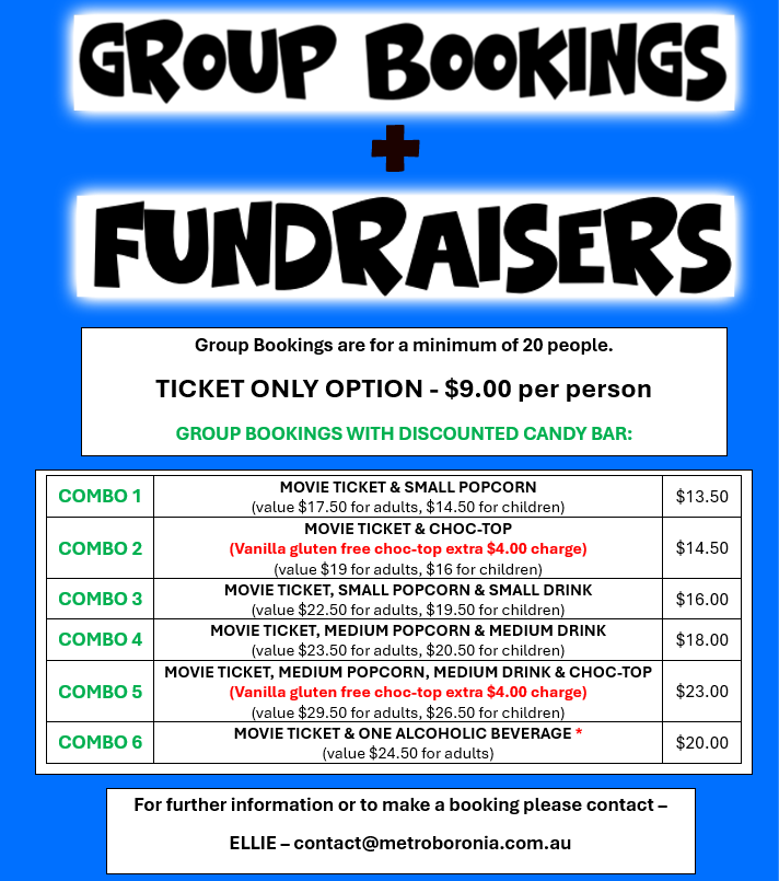 Please email Ellie at contact@metroboronia.com.au if you wish to discuss/book a group booking or fundraiser and we will get back to you within 24 hours, if you are yet to hear from us, please check your junk folder.